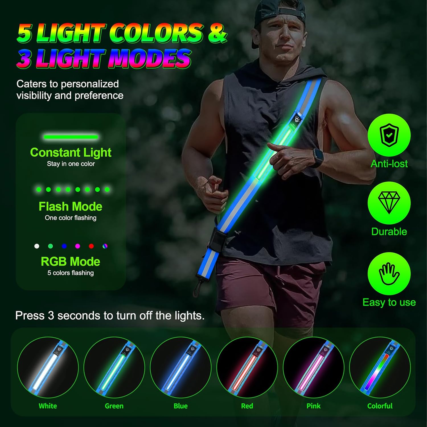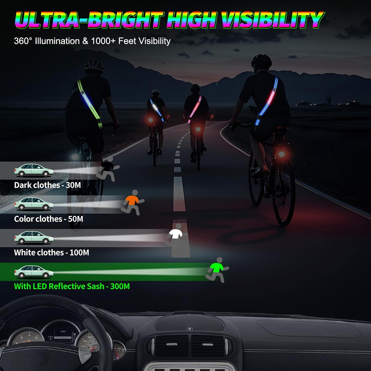 Equipped with an LED belt, reflective sash, and reflective armband, the gear provides full 360-degree visibility. You can be seen from up to 1000 feet away, significantly reducing the risk of accidents in the dark.